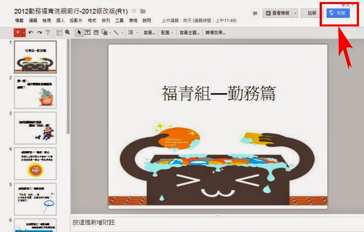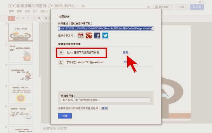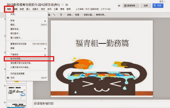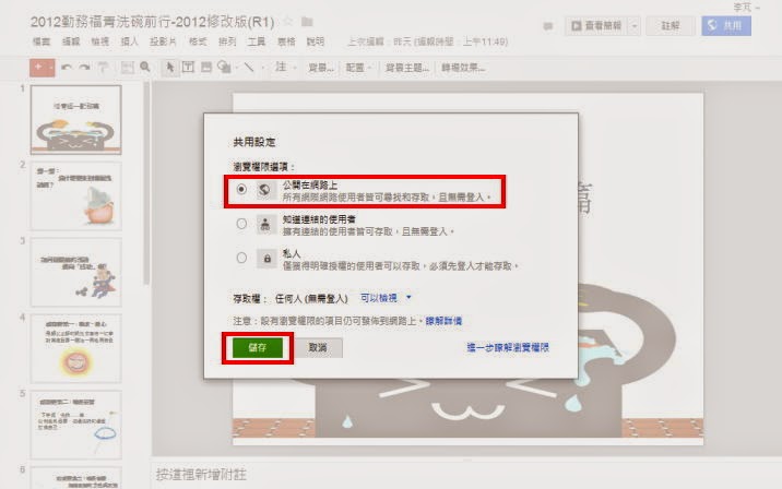二、開啟上傳好的PPT設定[網路共用]跟[網路發佈]的設定