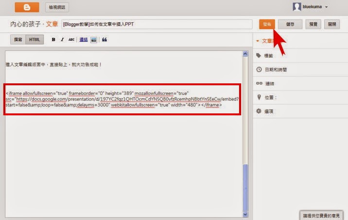 三、將[網路發佈]介面內[嵌入程式碼]的內容複製下來